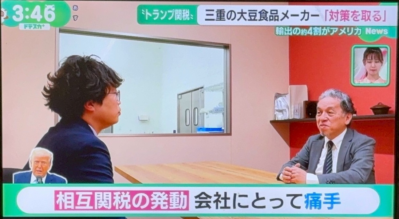 アメリカのトランプ大統領が「相互関税」として日本に24%の関税を課す考えを示したことについてメーテレより取材を受けました。自社商品や弊社工場内の様子なども放映されました。